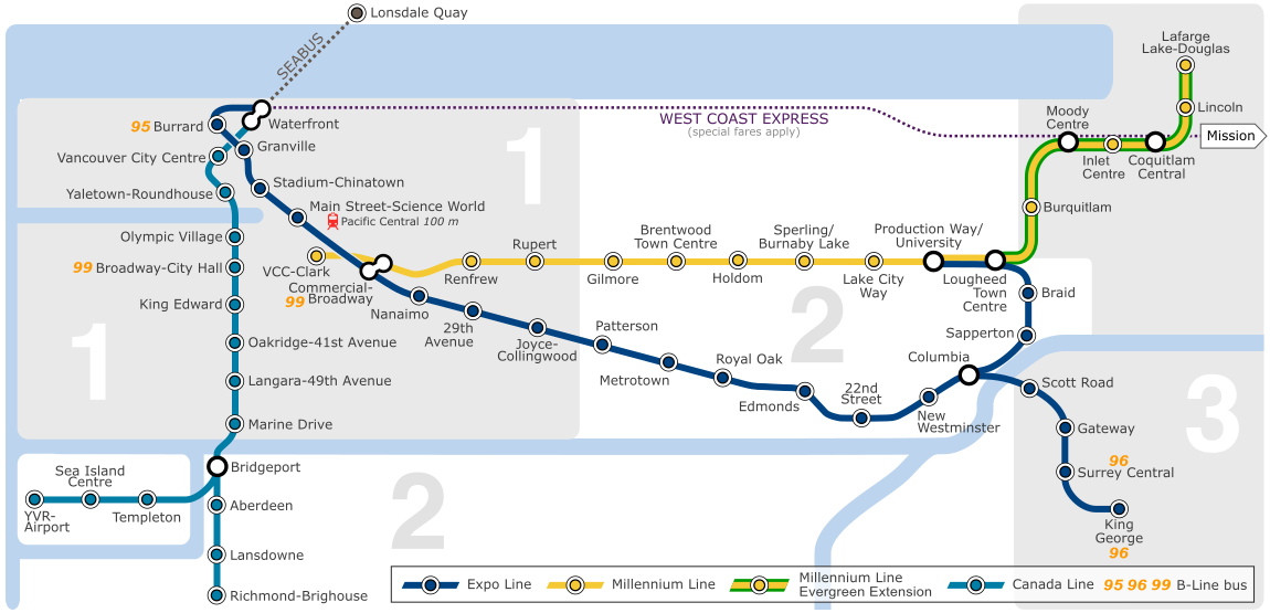 Pour rappel, le Skytrain de Vancouver, c’est trois lignes de métro automatiques et, avec ses 79,6km de lignes automatique, est le plus long système de métro complètement automatique au monde! Toutes les lignes sont équipées du système de contrôle automatique Seltrac de Thalès. Les lignes Expo et Millénium sont équipées de train avec des moteurs a induction linéaire Bombardier tandis que la ligne du Canada est équipée de trains standard livrés par Hyundai Rotem la rendant incompatible avec le reste du réseau.